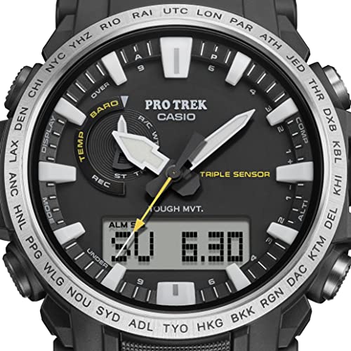 Case and urethane band and resin back cover. Biomass Plastic is a polymer material that contains renewable organic resources derived from chemical or biological synthesis and is expected to reduce the environmental load in order to achieve a circulation society. This time, the case and back cover are made of castor oil and the band is biomass plastic based on corn material. The soft urethane band uses a target guide, making it easier to read the direction of the second hand, and has a functional and beautiful design that makes it easier to understand your direction. The dial also features a thick hand and easy-to-read bar indexes for increased visibility. The PRW-61Y is designed with IP on the bezel. As the original function of the watch, it also combines practical functions such as multi-band 6 which receives radio waves from 6 stations around the world and tough solar. This model is perfectly sized for functionality and practicality that is suitable for various occasions. • Tough Solar (solar charging system).Operating time when fully charged without solar power: About 6 months when using functions; when power-saving state; About 25 months • Water-resistant to 10 ATM. • Radio reception function: Automatic reception (up to 6 times per day) (China radio waves up to 5 times per day) / Manual reception Reception radio wave: JJY, Frequency: 40 kHz/60 kHz (Fukushima / Kyus hu station model) Reception radio wave: WWVB, Frequency: 60 kHz If no radio wave reception is received, it will work with normal quartz accuracy (average monthly difference ± 15 seconds). • Automatic needle position correction function. • Needle evacuation function (manual and automatic when altitude, atmospheric pressure, temperature measurement). • World time: 29 cities around the world (29 time zones, with daylight saving setting function) + UTC (Coordinated Universal Time), home city exchange function, UTC direct call function. • Bearing measurement function: Measures 16 azimuth and azimuth angles (0 – 359°), continuous measurement of azimuth (60 seconds), northern direction indicator function, magnetic decagonal correction function, bearing correction function (2 point correction). • Altitude measurement function / Relative altimeter (measurement range: -700 ~ 10,000 m, 1 m unit), altitude difference indicator (measurement range 1:100 m / 5 m units, measurement range 2: 1000 m / 50 m units), altitude trend graph display, measurement interval setting function (5 seconds /2 minutes), altitude memory (measured date, date, time and altitude. 30 pcs Manual Memory), Auto Recording Data (Max/Lowest Altitude, Auto Accumulation (ascend/low) Memory) • The altimeter is a relative altimeter that converts barometric pressure changes to altitude. When the pressure changes depending on weather conditions, the altitude of measurements will change. • Barometric pressure measurement function (measurement range: 260 – 1,100 hPa, 1 hPa unit), pressure trend graph display (displays past 20 hours), atmospheric pressure difference indicator (measurement range: ± 10 hPa units), atmospheric pressure trend information alarm (arrow and alarm will notify you when a characteristic change of atmospheric pressure occurs). • Temperature measurement function (measurement range: -10 ~ 60 ℃, 0.1 ℃ units) • Stopwatch (1/100 second, 24-hour meter) • Timer (measured in increments of 1 minute, maximum set of 60 minutes, and 1-second increments). • 5-time alarms, time signal. • Battery indicator display. • Power saving function. • Fully automatic calendar. • Switch between 12 and 24-hour displays. • Low-temperature resistance (-10 ℃) • Control sound ON/OFF switch. • Double LED Light: Dial LED Light (Full Auto Light, Super Illuminator, Afterglow Function, Afterglow Time Switching (1.5 sec/3 seconds), LED Back Light (Full Auto Light, Super Illuminator, Afterglow Function, Afterglow Time Switching (1.5 sec/3 seconds)