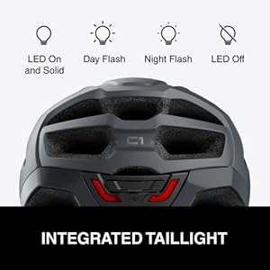 The C1 bike helmet features built-in 4-way Bluetooth intercom, allowing for full-duplex communication between up to four helmets. Smartphone connectivity allows users to pair a smartphone to the C1 to stream music, hear turn-by-turn GPS directions, cues from fitness apps, or take phone calls. The C1 also features an integrated taillight in order to improve bicyclist visibility. Age grade: 13 years and up.